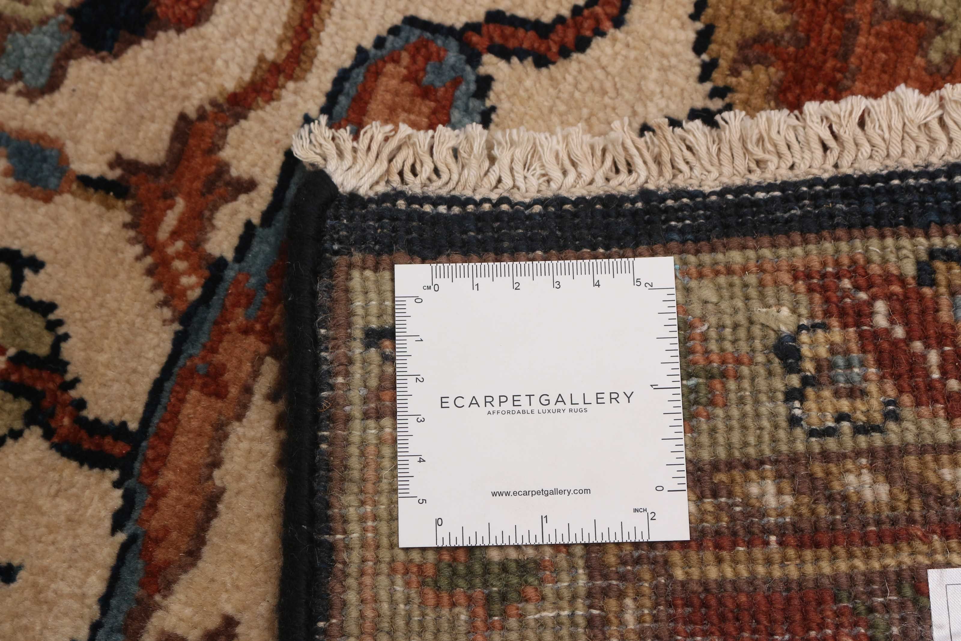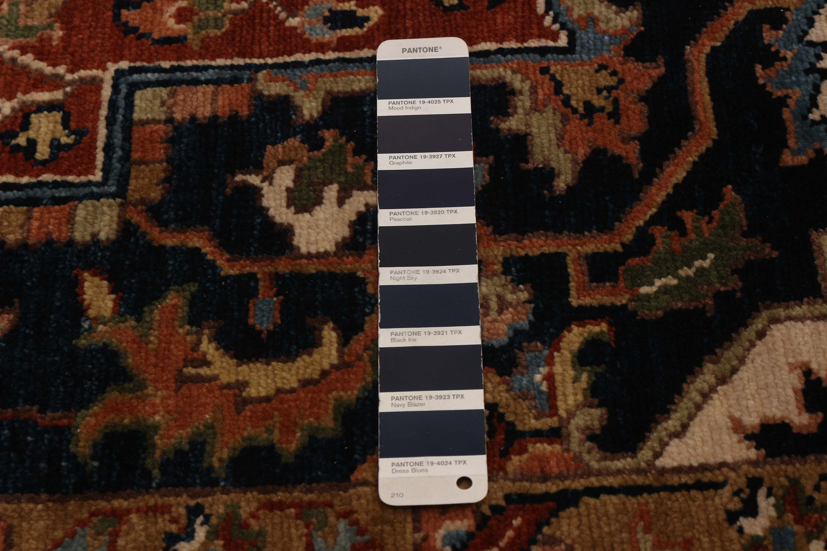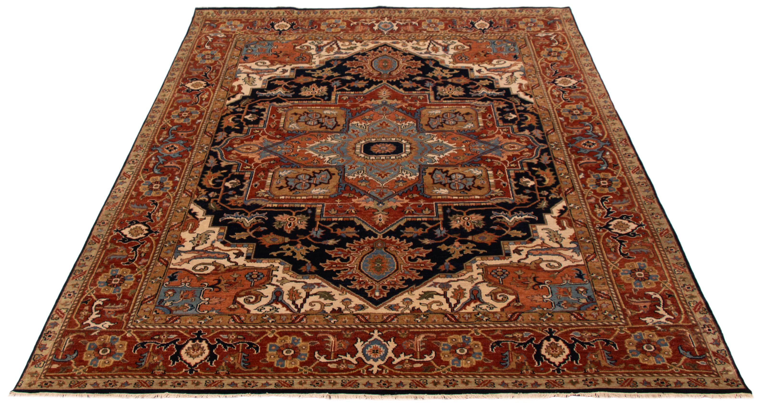 Tapis noué à la main de belle qualité avec des motifs persans Heriz anciens Tapis bordé de style traditionnel avec des couleurs d'accent cuivre, cuivre foncé, bleu marine foncé, ivoire, kaki, marron clair et turquoise. Importé d'Inde et fabriqué selon les meilleures techniques de tissage Noué à la main et fabriqué à partir de 100 % de laine avec une base 100 % coton. 7 pieds 10 pouces sur 9 pieds 11 pouces (238,8 cm x 302,3 cm)