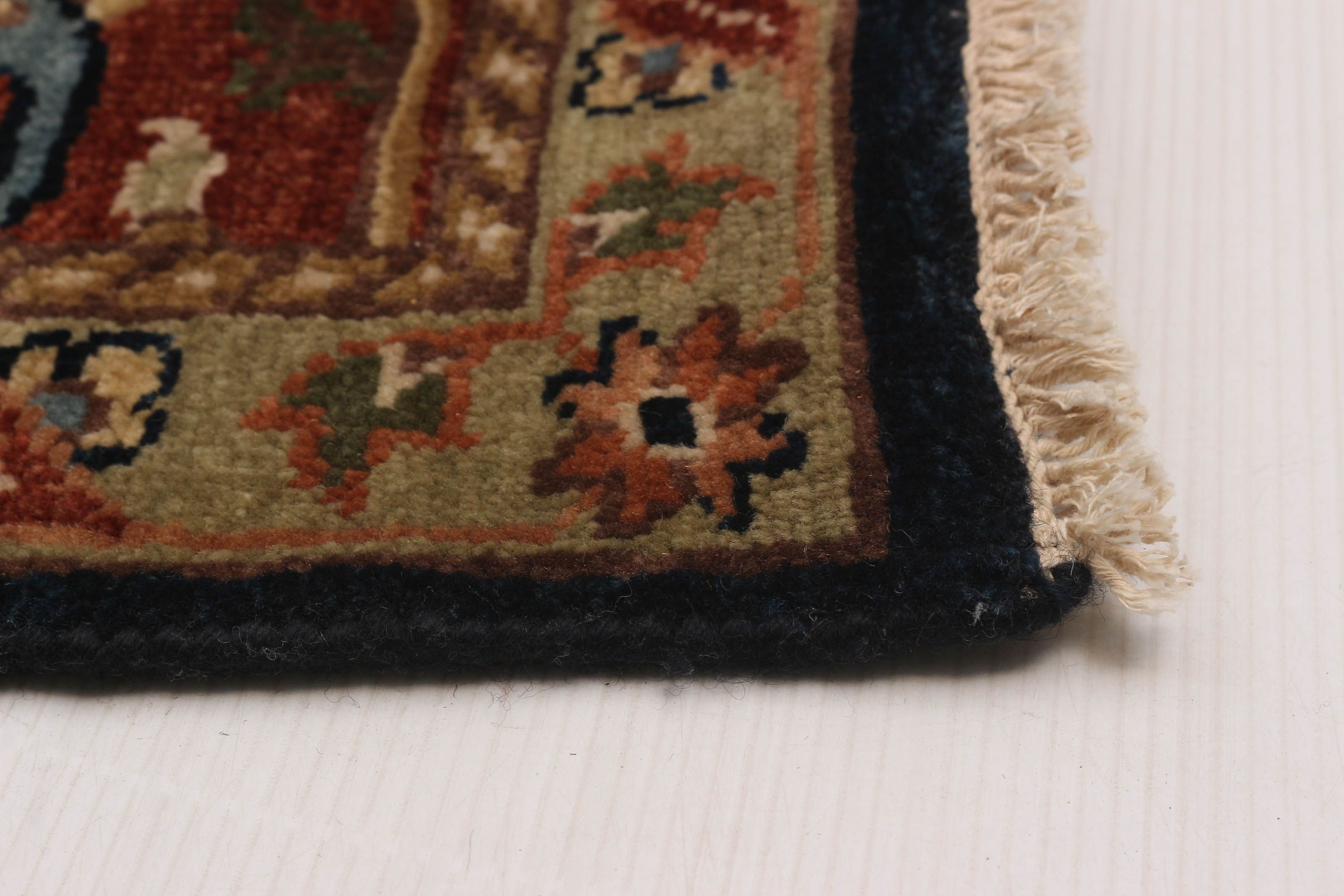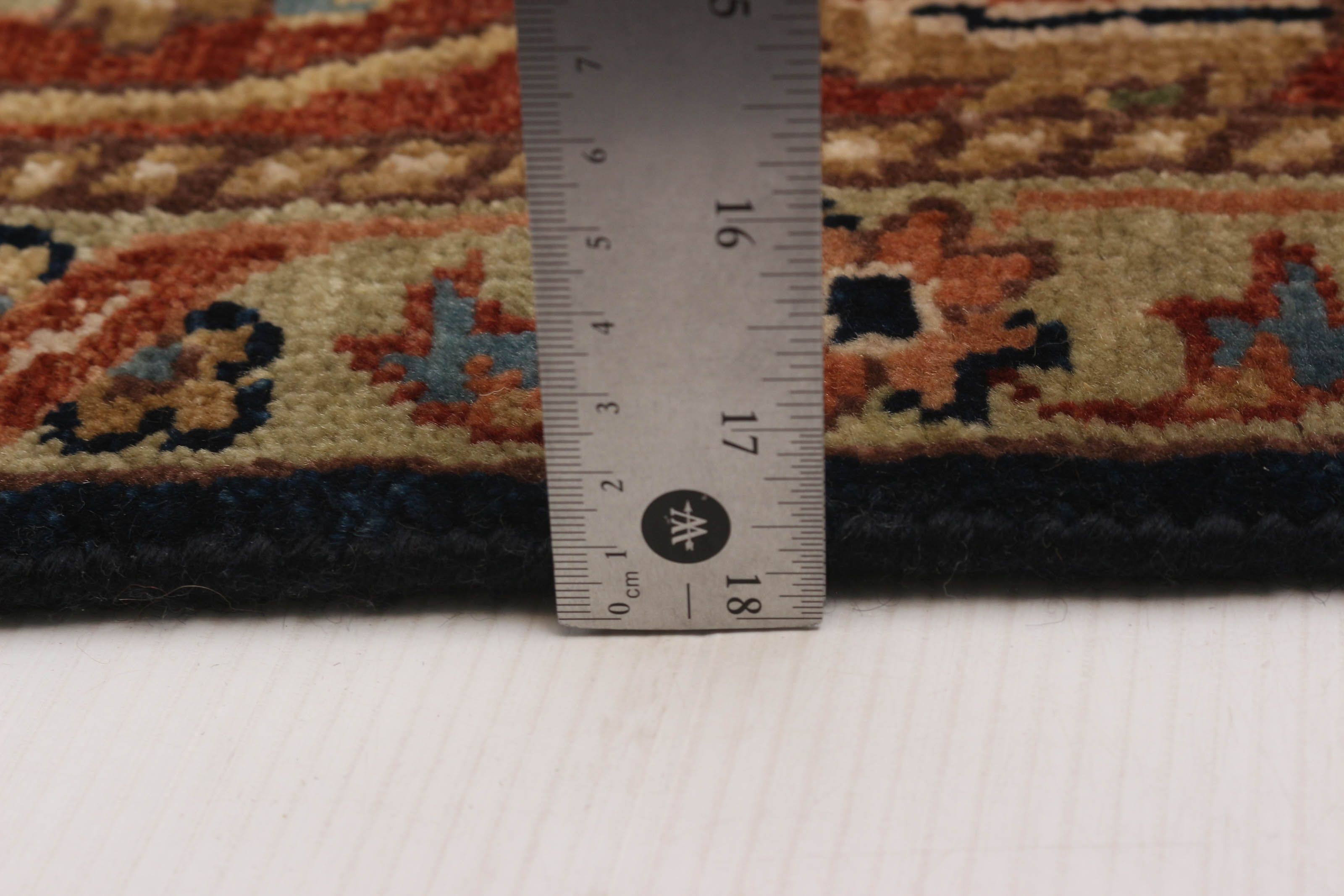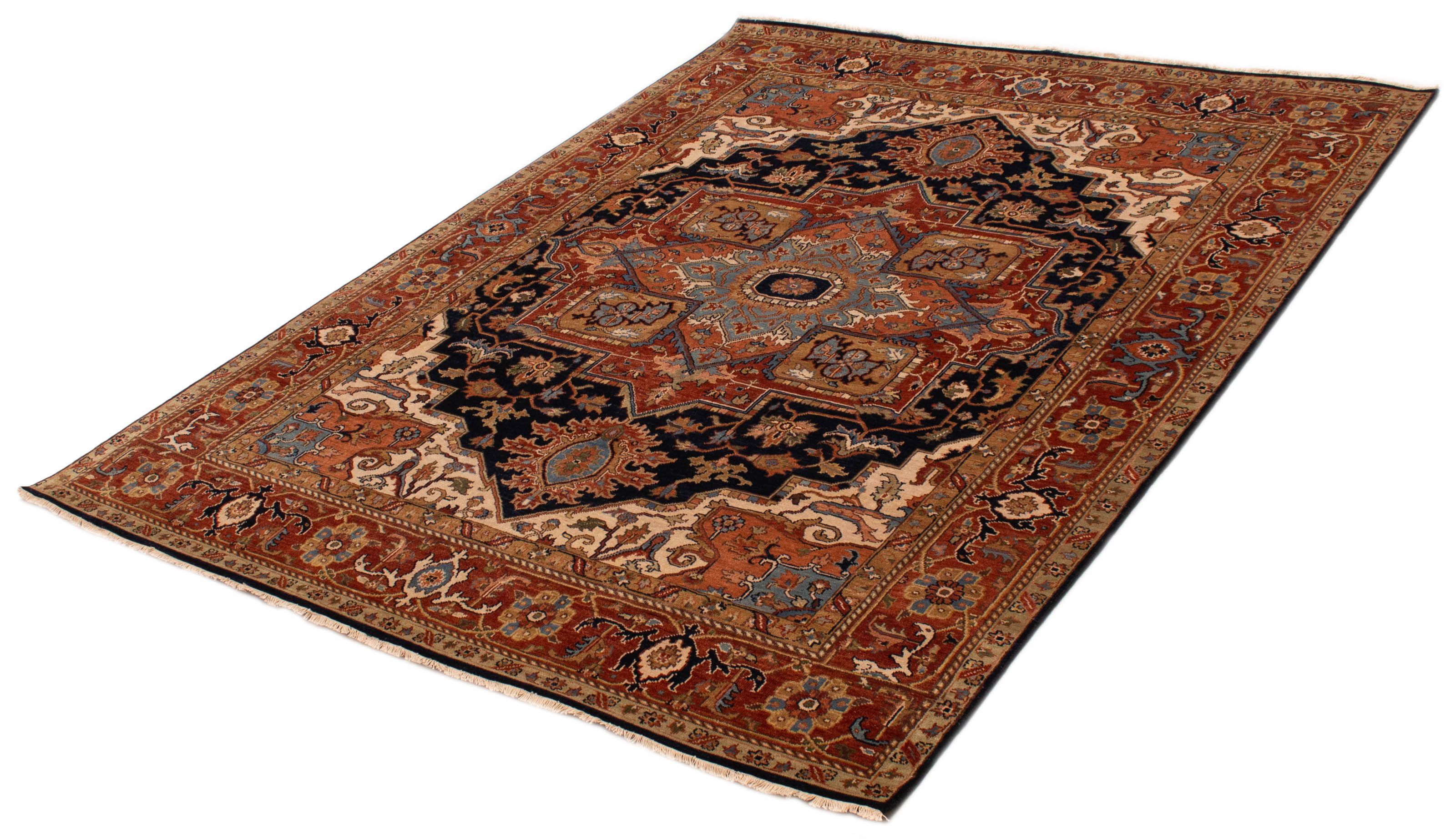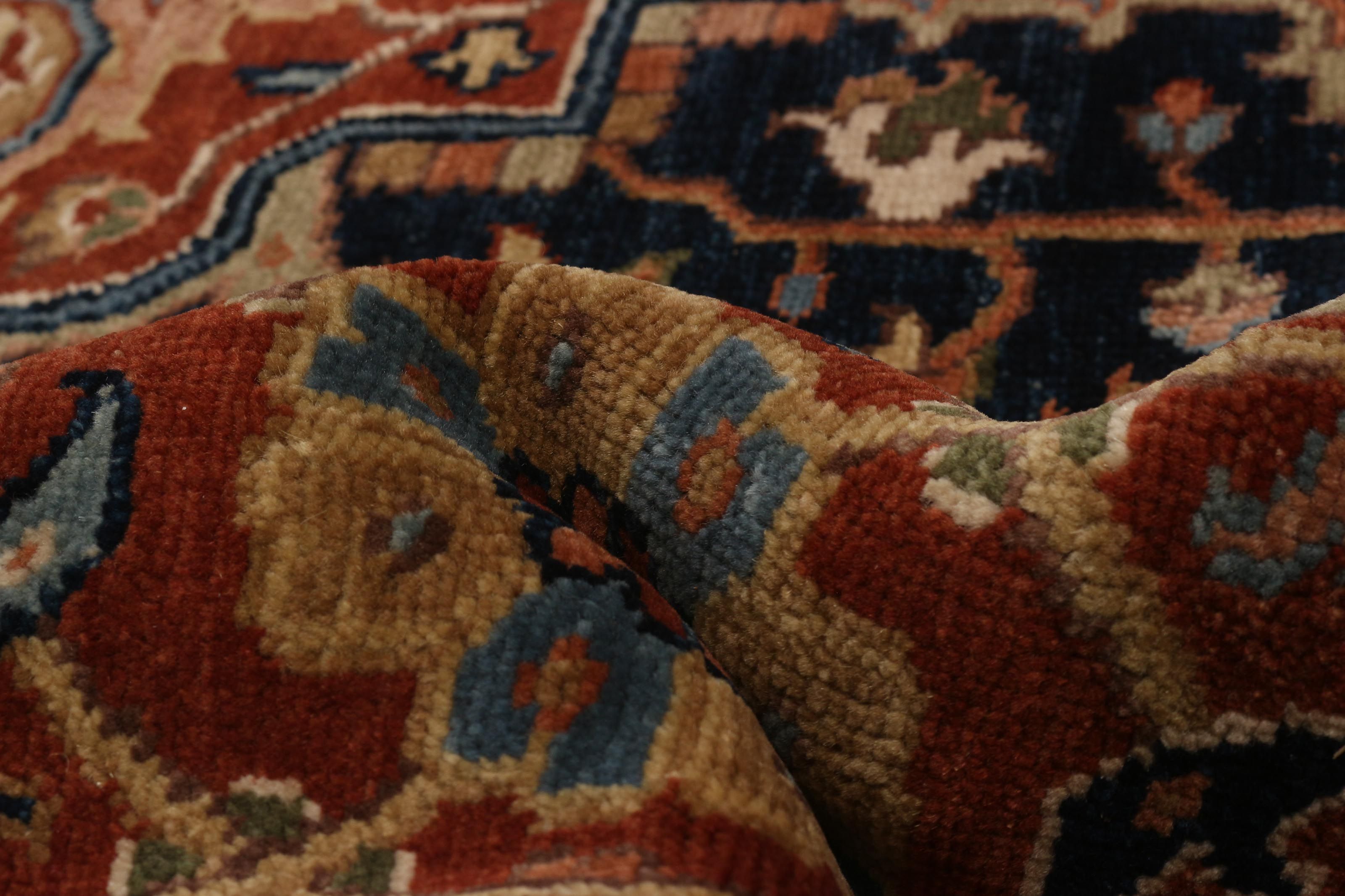 Tapis noué à la main de belle qualité avec des motifs persans Heriz anciens Tapis bordé de style traditionnel avec des couleurs d'accent cuivre, cuivre foncé, bleu marine foncé, ivoire, kaki, marron clair et turquoise. Importé d'Inde et fabriqué selon les meilleures techniques de tissage Noué à la main et fabriqué à partir de 100 % de laine avec une base 100 % coton. 7 pieds 10 pouces sur 9 pieds 11 pouces (238,8 cm x 302,3 cm)
