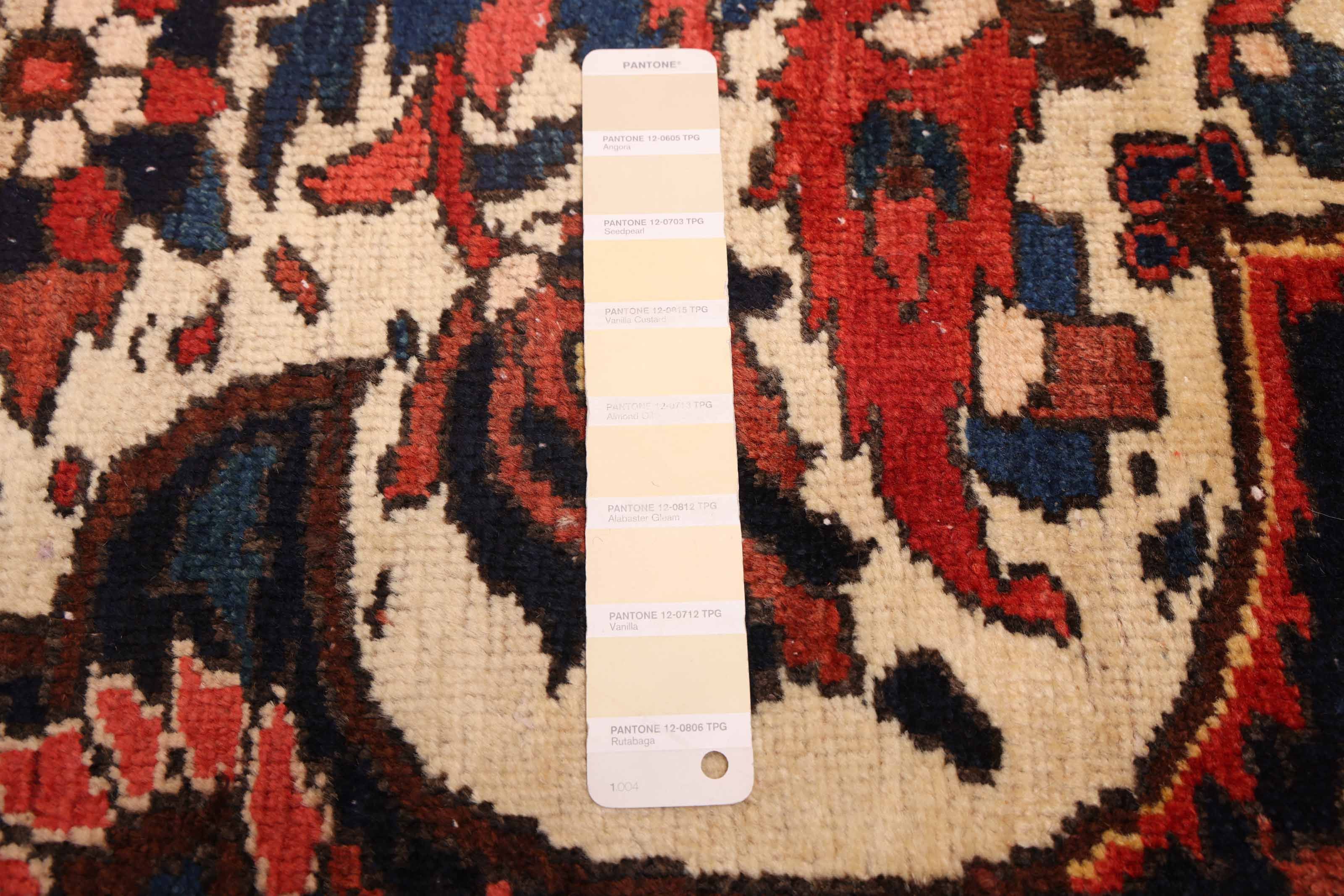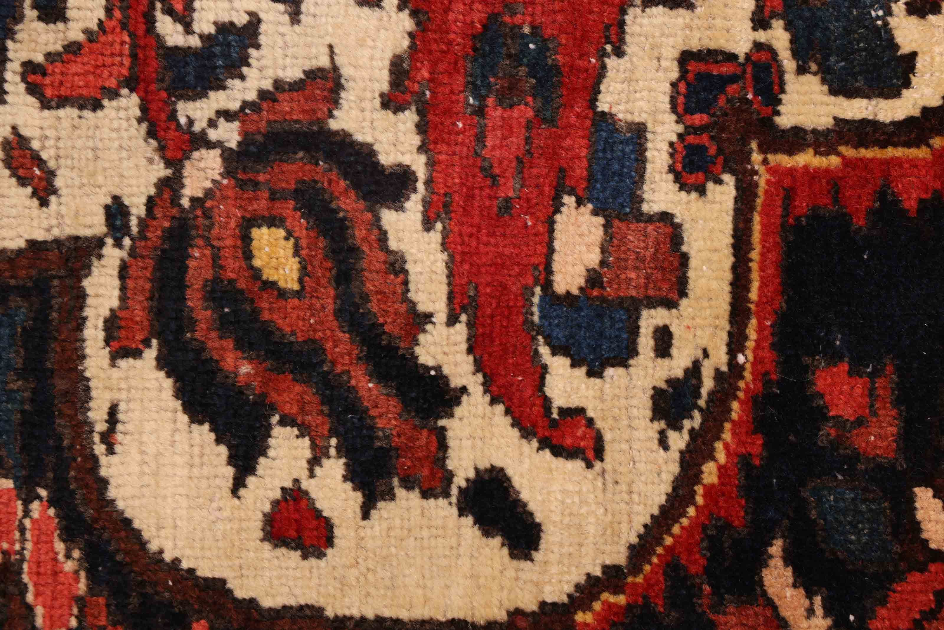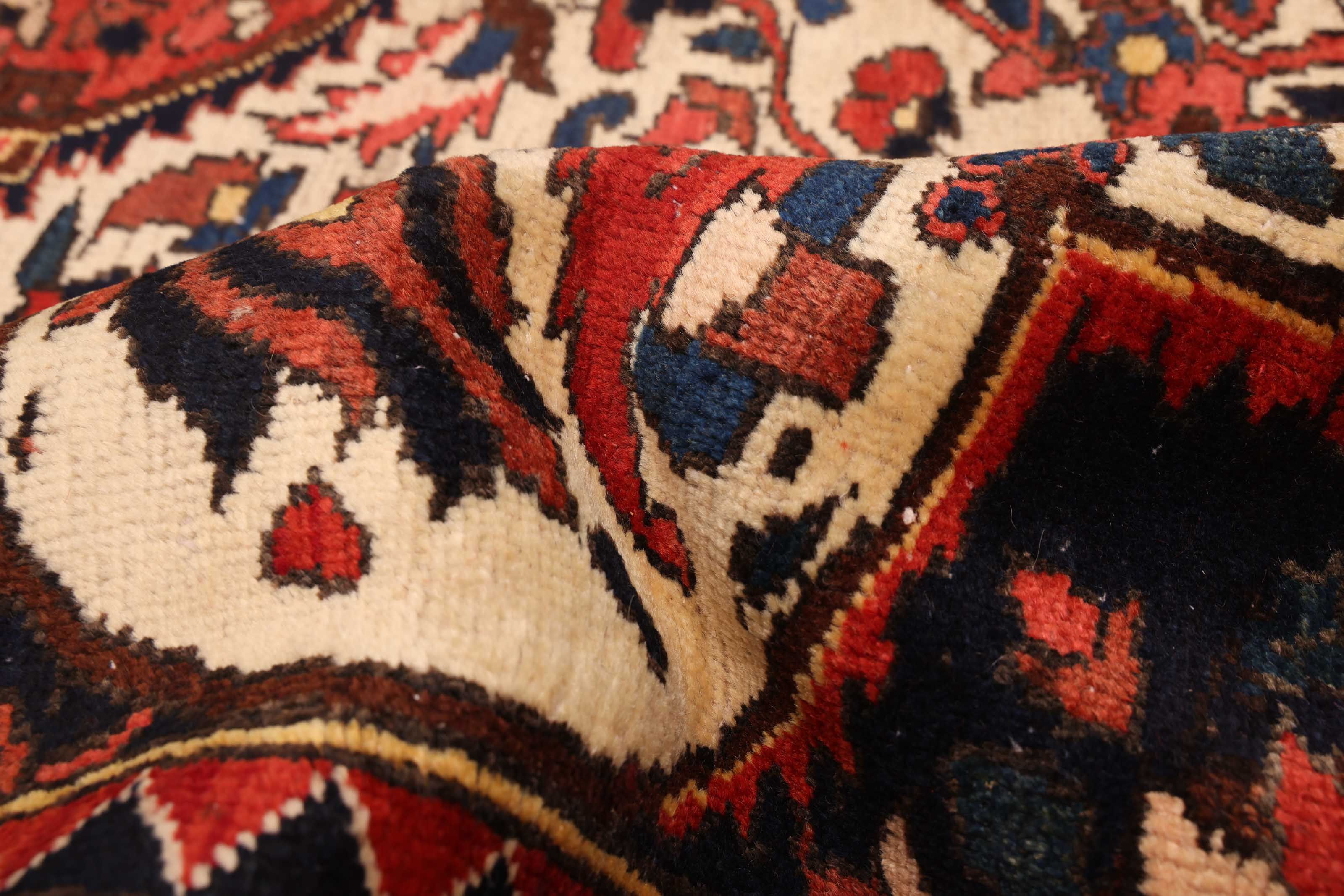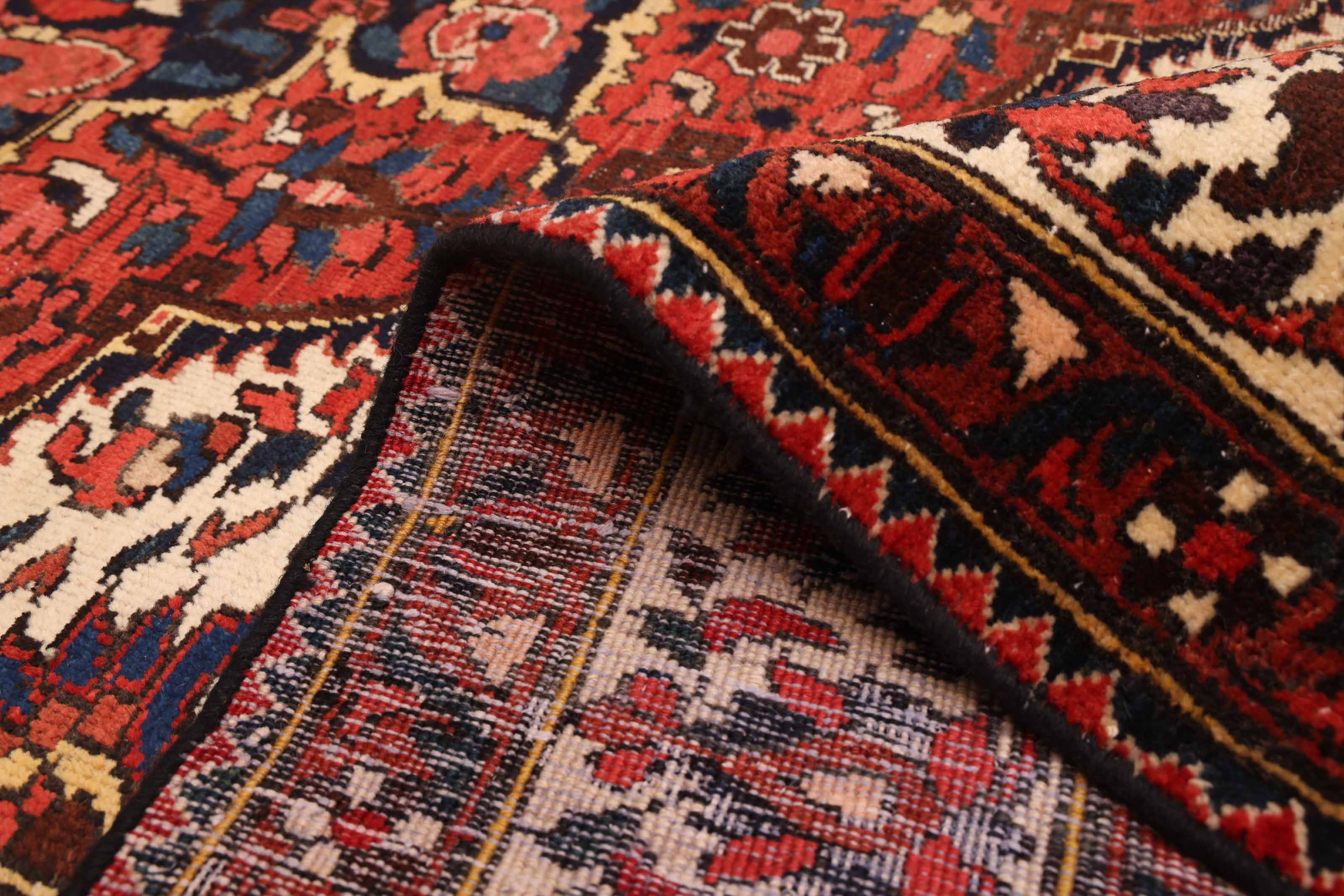 Colorful, handmade area rugs characterized by striking Caucasian patterns Traditional, Vintage/Distressed style rug with Blue, Cream, Dark Navy, Dark Red, Light Gold, Red accent colors Imported from Turkey and crafted using the finest weaving techniques Hand-knotted and constructed from 100% Wool with 100% Cotton foundation 7-Feet 5-Inch by 10-Feet 5-Inch (225cm x 317cm)